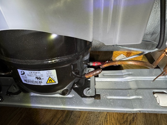 Three calls later, Renovator Appliance Repair, came to the rescue. The verdict: the copper tubing to the compressor had snapped when the fridge was originally pushed into place. And because the system had been open to air for nearly a year, the damage went deeper than a simple repair. The technician ended up replacing the copper line, the compressor, and the dryer, then refilled the system with R600A.